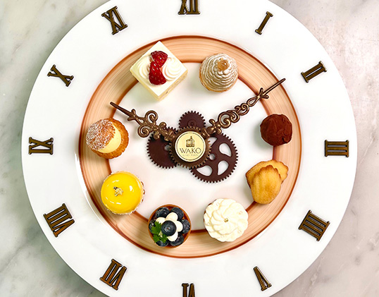 グランシェフ パティシエ兼シェフ ショコラティエ・小熊亮平が考案した「和光=時計塔」をイメージしたデザート。ケーキ、焼菓子のミニサイズ版と、定番の生チョコレート・トリュフナチュールを一皿でご堪能できる。目にも楽しい一品。時計の針もチョコレート製、楽しく召し上がれる。